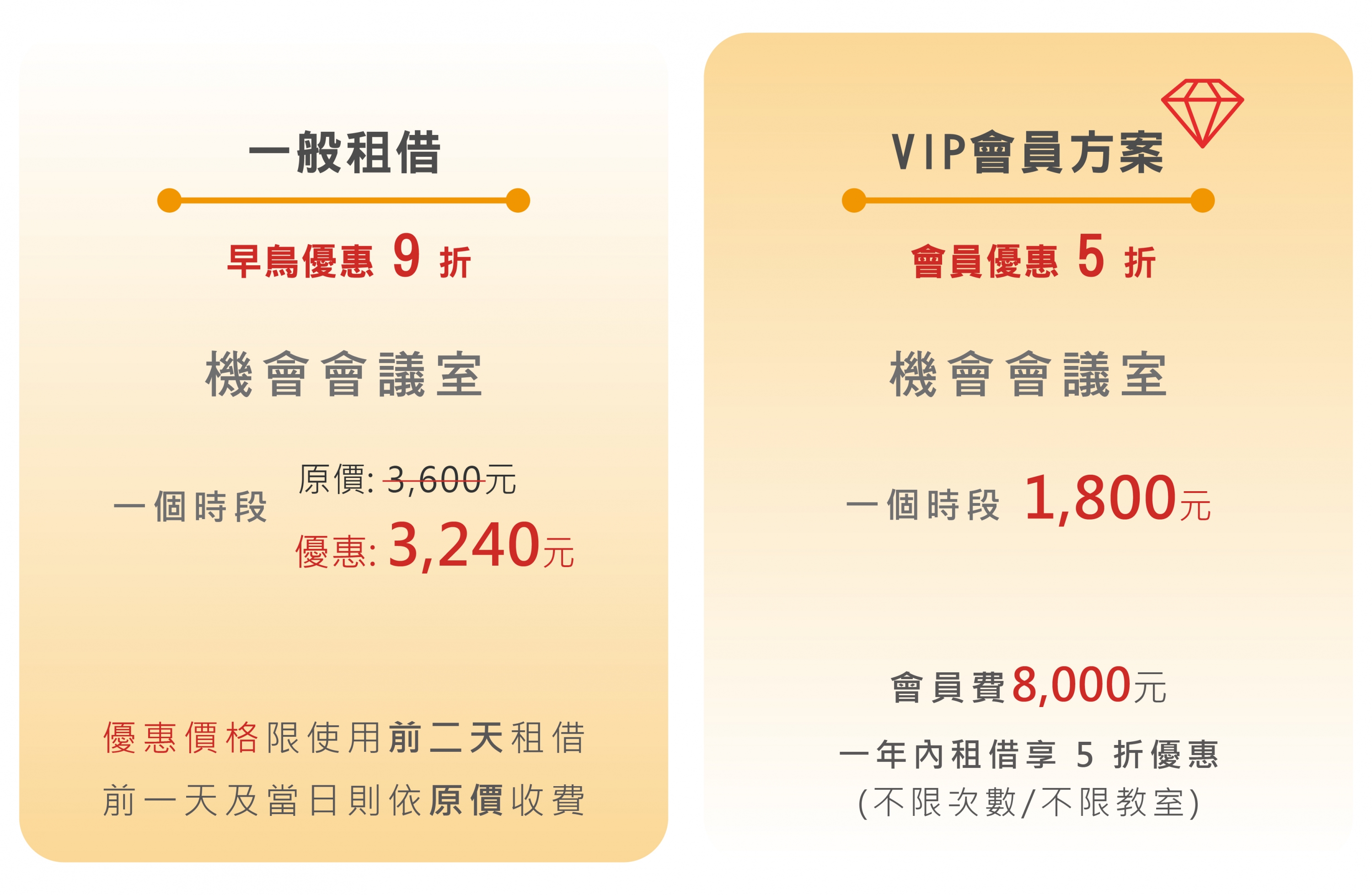 立即預定場地 機會-會議室 台南場地租借-機會會議室 場地平面圖 租借方式與優惠說明 ▍時段租借 註:一個時段4小時,時間已含進場場佈及離場時間。 ▍租借費用 註: 1. 早鳥優惠限使用前二天租借付款,前一天及當日租借付款則依原價收費。 2. 完成付款才能預定教室。 3. 會員優惠折扣依原價算折數。 會員優惠方案 : 1.初次租借並加入會員方案,需先支付會員費,當筆訂單即享會員折扣。 2.會員費非儲值金,無法折抵場租費用。 3.會員優惠期限從付款日起算12個月。平日、假日皆可使用,不限次數。 4.可跨區使用(台南中西區中正場地 / 高雄三民區博愛場地) 5.完成繳納會員費用,則不受理會員費退費。 6.如欲加入會員,請與我們聯繫。 LINE ID : @dream-space 空間設備介紹 ▍機會會議室 13坪空間,可容納28人 中央空調、EPSON投影機、音響、全版面白板、LED護眼燈 ▍空間安全 符合政府辦訓規範 隔間材料具備1小時防火能力矽酸鈣板 建築消防安檢合格,具公共意外責任險36,000,000 ▍公共區域 ▍服務提供 適合說明會、研討會、講座、課程、公司內訓、餐會聚餐、攝影拍攝、記者會、音樂表演、靜態展覧等活動。 實際使用狀況 租借須知 ▍注意事項 1.本空間桌椅禁止移動,下訂前請先查看環境照片。 2.活動結束請協助將圾垃分類至圾垃區並恢復環境整潔。 3.本場地之牆面、所有設備及地板不得塗寫、釘、掛、黏貼等行為,若造成毀損,應予以照價賠償。 4.本場地公共區域的桌椅及物品請勿自行移動,如有需求,請洽櫃檯人員。 5.禁止攜帶寵物、吸菸、烹飪開伙、點香/點火/點蠟燭,以及賭博等違法行為。 6.場地超時計算方式: 以一小時為單位! 超時使用三十分鐘內 ~ 一小時,以一小時原價計費; 超時一小時(含)以上 ~ 二小時,以二小時原價計費...依此類推。 7.租借優惠價格限使用前二天付款,前一天及當日付款則依原價收費。 8.下訂即代表同意本場地規定,有任何問題歡迎聯繫,謝謝! ▍非營業時間租借 長期租借者、辦訓單位等,或有時段租借以外的需求,請與我們聯繫! LINE ID : @dream-space 洽詢電話 : 06-2235159、07-3227272 ▍取消規範 1.場地租借完成匯款/刷卡後即為正式合約。 2.下訂後到使用前7天欲辦理取消退費,會扣50%手續費用(付款金額x50%=退款金額), 亦可延後三個月內使用(僅限乙次)。 3.使用前6天不再接受取消或延後。 4.租借當日若遇天然災害,地方政府宣布停班停課,本空間將停止營業。 當日場次可延後使用,或申請退費(因不可抗力因素,不扣手續費用) *停班課範圍不含【高雄市三民區/台南市中西區】當日則正常營業,若取消活動,則不受理退費與延期 5.下訂即代表同意本場地規定,請確認後再下訂,以確保租借雙方權益。 場地行事曆 交通位置 台南市中西區中正路240號6樓-臺灣銀行 安平分行 (一樓為臺灣銀行,寶雅百貨旁) ●搭乘高鐵-至台南站》轉搭臺鐵沙崙支線》至台南火車站》轉乘公車或計程車 ●搭乘臺鐵-至台南車站前站下車》步行2分鐘》至台南火車站南/北站轉乘公車 ●搭乘公車-台南火車站南站可搭14至中正商圈站下車》步行1分鐘 ●搭乘公車-台南火車站北站可搭5/18/19至西門友愛街口站下車》步行4分鐘 ●自行前往-停車資訊請參考下方圖示 立即預定場地