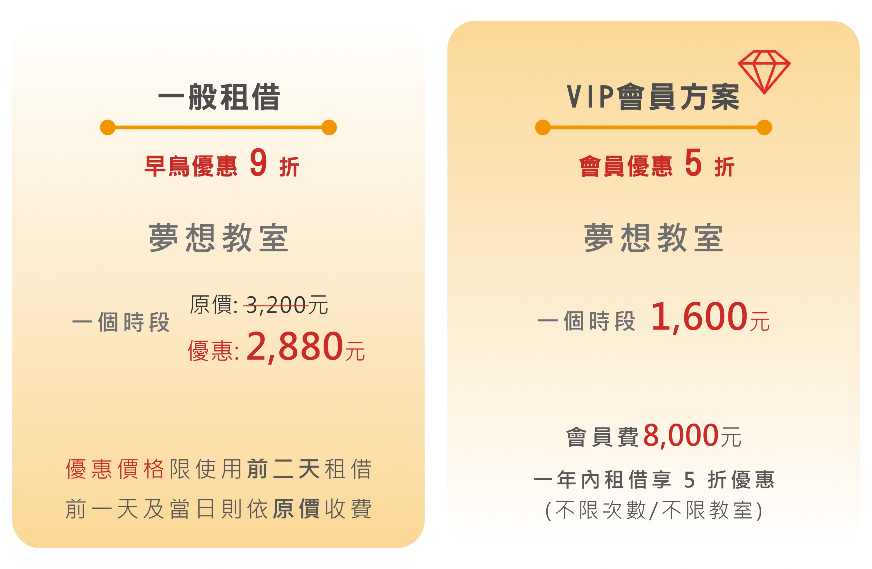 立即預定場地 夢想教室 高雄場地租借-夢想教室 場地平面圖 租借方式與優惠說明 ▍時段租借 註: 一個時段4小時,時間已含進場場佈及離場時間。 ▍租借費用 註: 1. 早鳥優惠限使用前二天租借付款,前一天及當日租借付款則依原價收費。 2. 完成付款才能預定教室。 3. 會員優惠折扣依原價算折數。 會員優惠方案 : 1.初次租借並加入會員方案,需先支付會員費,當筆訂單即享會員折扣。 2.會員費非儲值金,無法折抵場租費用。 3.會員優惠期限從付款日起算12個月。平日、假日皆可使用,不限次數。 4.可跨區使用(台南中西區中正場地 / 高雄三民區博愛場地) 5.完成繳納會員費用,則不受理會員費退費。 6.如欲加入會員,請與我們聯繫。 LINE ID : @dream-space 清潔費用 本空間不開放飲食(含公共區域) 如進入本空間會食用早/午/晚餐之餐點及蛋糕、點心、餅乾等任何食品,將酌收清潔費用400元。 *白開水、飲料免列入清潔費收費之項目 註 : 1. 租借時請主動告知是否會飲食。 2. 活動結束請協助將圾垃分類至圾垃區並恢復環境整潔。 3. 租借費用若未含清潔費,活動當天有飲食,將依規定加收清潔費用。 空間設備介紹 ▍夢想教室 12坪空間,可容納33人 中央空調、EPSON3600流明投影機、YAMAHA高級音響、全版面白板、LED護眼燈管等設備 ▍空間安全 符合政府辦訓規範 隔間材料具備1小時防火能力矽酸鈣板 建築消防安檢合格 ,具公共意外責任險 48,000,000 ▍公共區域 ▍服務提供 適合說明會、研討會、講座、課程、公司內訓、餐會聚餐、攝影拍攝、記者會、音樂表演、靜態展覧等活動。 實際使用狀況 租借須知 ▍注意事項 1.本場地可攜帶飲料入場,若用餐將酌收清潔費,依照每間教室收費標準。 2.活動結束請將垃圾帶走並恢復環境整潔。 3.如有移動桌椅,活動結束前須恢復原狀。 4.本場地之牆面、所有設備及地板不得塗寫、釘、掛、黏貼等行為,若造成毀損,應予以照價賠償。 5.本場地公共區域的桌椅及物品請勿自行移動,如有需求,請洽櫃檯人員。 6.禁止攜帶寵物、吸菸、烹飪開伙、點香/點火/點蠟燭,以及賭博等違法行為。 7.場地超時計算方式: 以一小時為單位! 超時使用三十分鐘內 ~ 一小時,以一小時原價計費; 超時一小時(含)以上 ~ 二小時,以二小時原價計費...依此類推。 8.超過租借教室規範的人數,加一張椅子加收50元。 9.租借優惠價格限使用前二天付款,前一天及當日付款則依原價收費。 10.下訂即代表同意本場地規定,有任何問題歡迎聯繫,謝謝! ▍非營業時間租借 若有時段租借以外的需求,請與我們聯繫! LINE ID : @dream-space 洽詢電話 : 07-3227272 ▍取消規範 1.場地租借完成匯款/刷卡後即為正式合約。 2.下訂後到使用前7天欲辦理取消退費,會扣50%手續費用(付款金額x50%=退款金額), 亦可延後三個月內使用(僅限乙次)。 3.使用前6天不再接受取消或延後。 4.租借當日若遇天然災害,地方政府宣布停班停課,本空間將停止營業。 當日場次可延後使用,或申請退費(因不可抗力因素,不扣手續費用) *停班課範圍不含【高雄市三民區/台南市中西區】當日則正常營業,若取消活動,則不受理退費與延期 5.下訂即代表同意本場地規定,請確認後再下訂,以確保租借雙方權益。 場地行事曆 交通位置 高雄市三民區博愛一路287號9樓-世貿金星大樓 (一樓為高雄銀行,入口大門在綏遠二街) 捷運後驛站4號出口 ●搭乘高鐵-至左營站下車》轉乘捷運紅線》至後驛站》4號出口》步行1分鐘 ●搭乘臺鐵-至高雄火車站》轉乘捷運紅線》至後驛站》4號出口》步行1分鐘 ●搭乘公車-可搭紅28/紅31/301/33至捷運後驛站下車》步行2分鐘 ●搭乘輕軌-至愛河之心站》轉乘捷運凹子底站》至後驛站4號出口》步行1分鐘 ●自行前往-停車資訊請參考下方圖示 立即預定場地